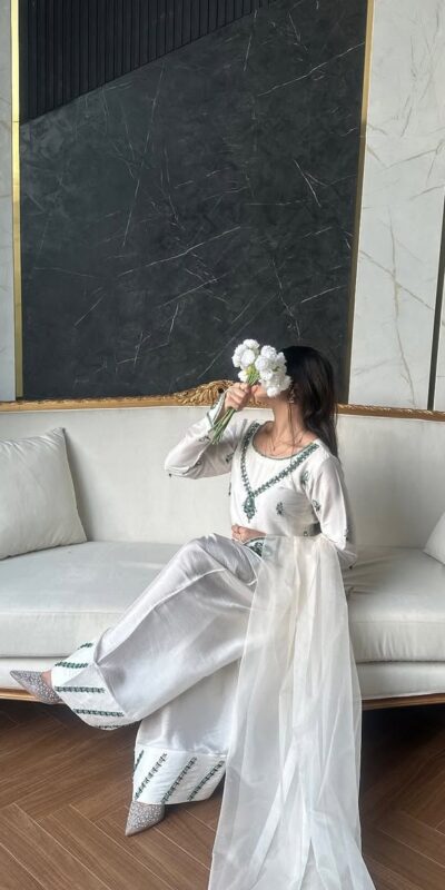 White Natural Crap Embroidery Mirror Work Salwar Suit