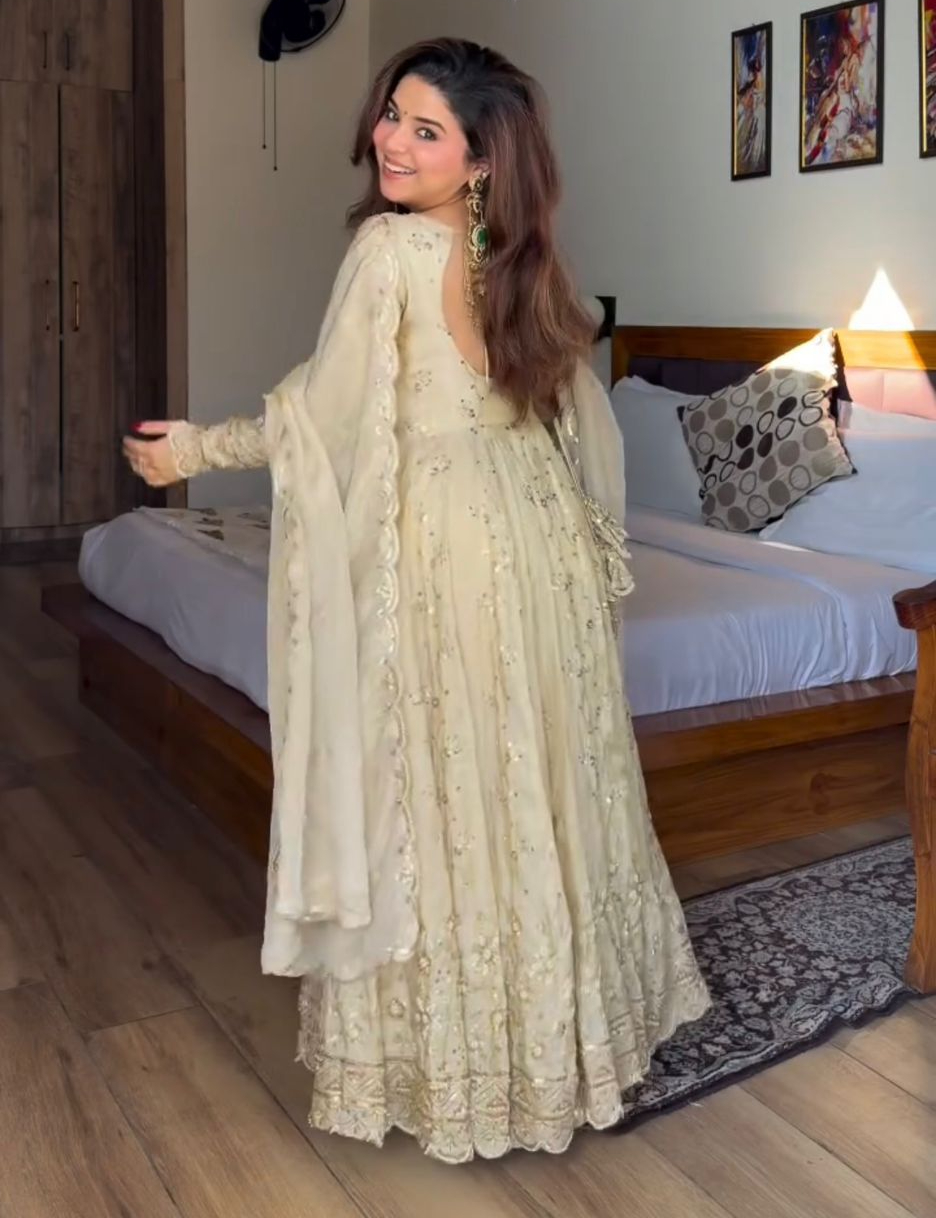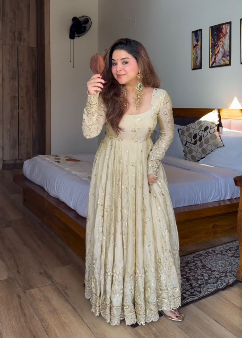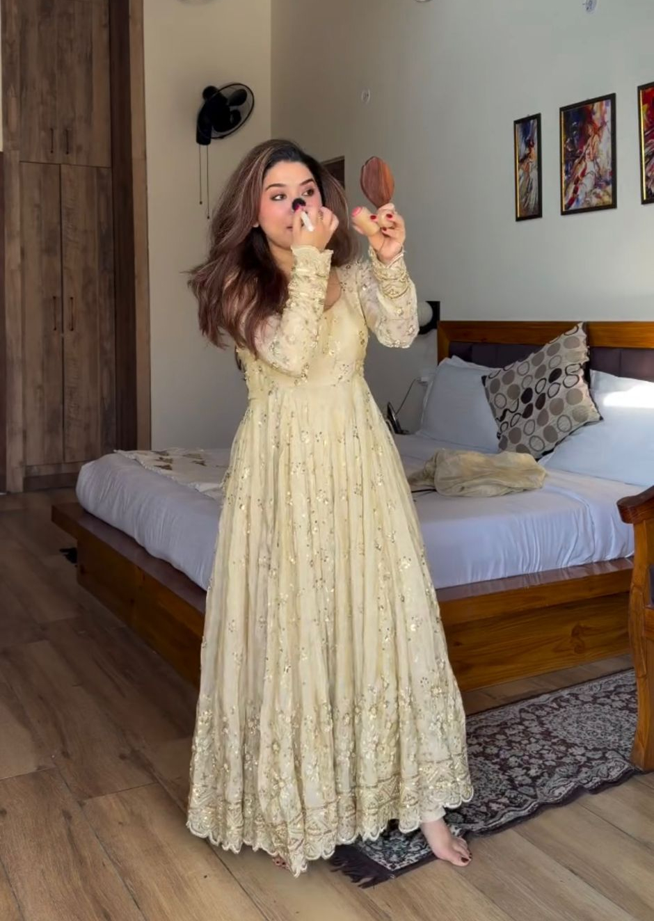 Alluring Cream Crunchy Silk Embroidery Work Anarkali Suit