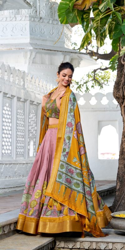 Amazing Yellow Color Dola Silk Kalamkari Print Zari Border Lehenga Choli
