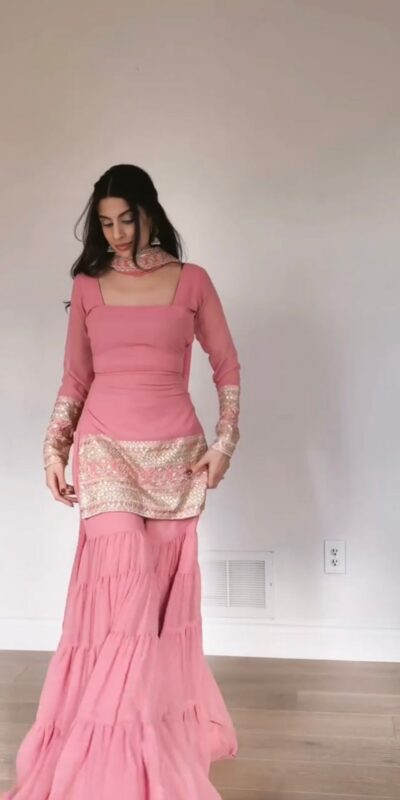 Top Fabric: Faux Georgette Lining: Soft Micro Cotton Work: Thread with 9 Mm Sequence Sizes: Free Size Semi Stitched Length: 41 inch Sharara Fabric : Faux Georgette Fit : Fully Stitched up to Size 44 with Stretchable Elastic Waist Length: 42 inches Dupatta Fabric : Faux Georgette Work : thread with 9 mm Sequence with 4-Side work border Length: 2.2 meters |