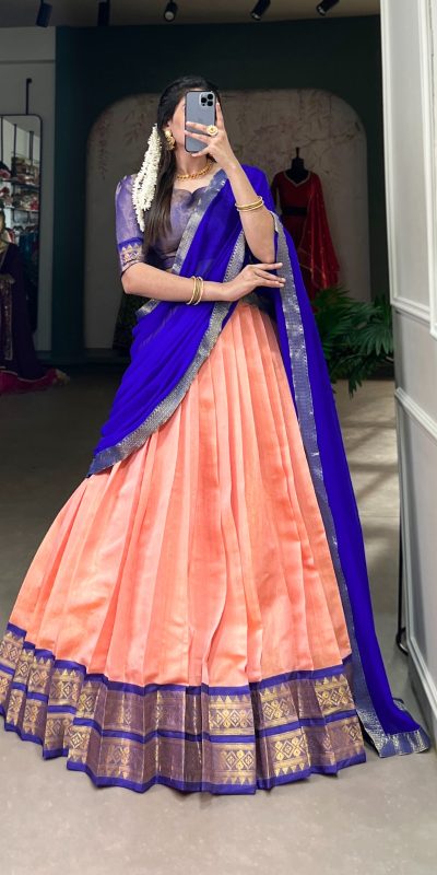 Beautiful Peach Color Kanchipuram Zari Weaving Work Lehenga Choli