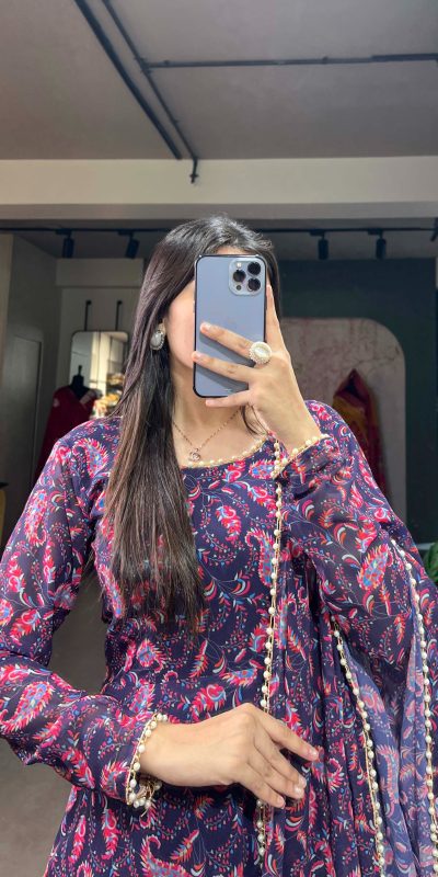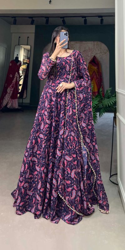 | Fabrics | Gown Fabric : Georgette Gown Length : 58 Inches Inner : Silk (full up to bottom) Work :Floral Print Size : Free Size Type : Semi Stitched Gown Flair : 4.5 M Bottom : No Dupatta Fabric : Georgette Work : Floral Print and Pearl Lace Border Dupatta Length : 2.4 mtr |