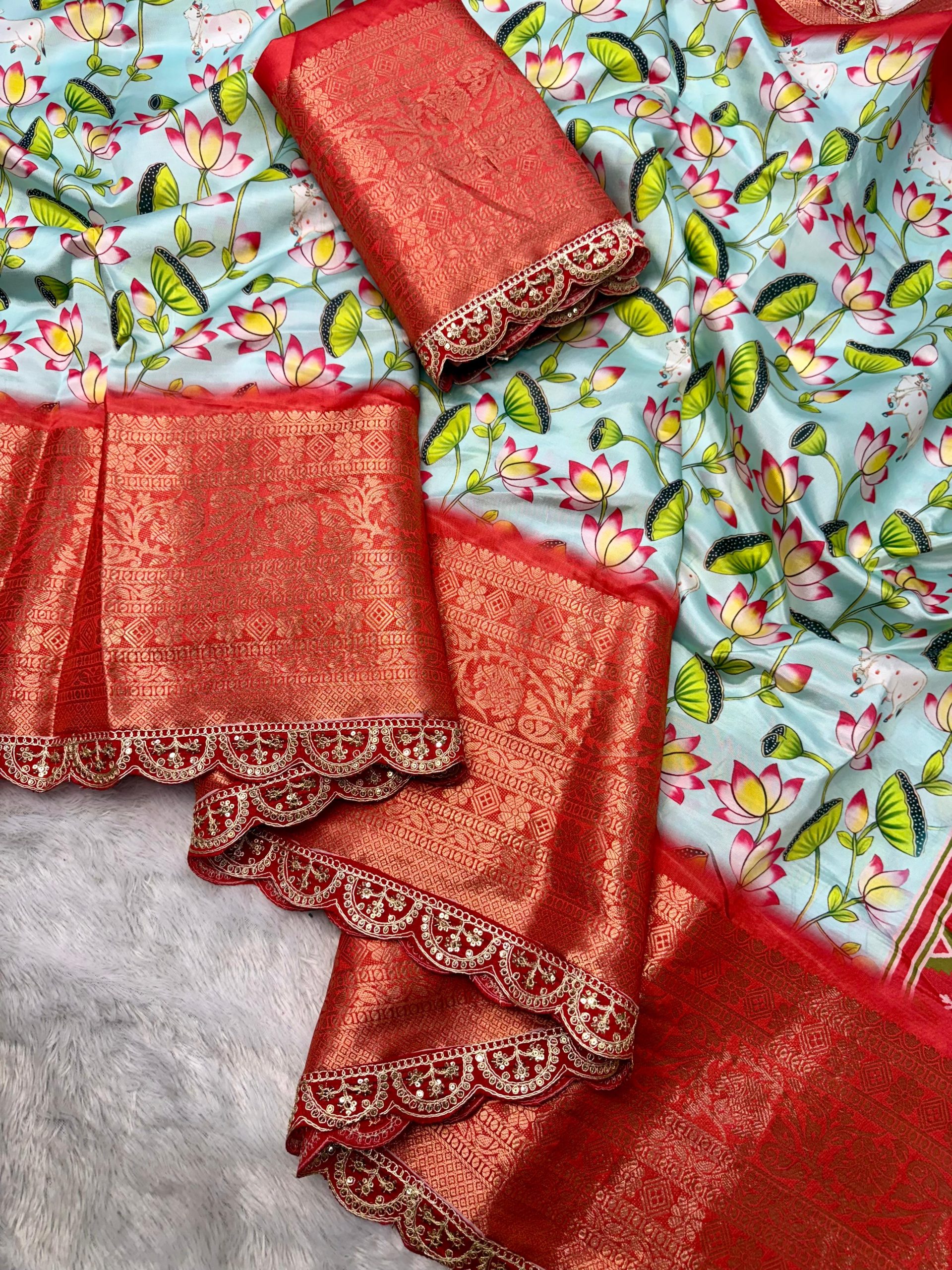 | Fabrics | Saree : Dola silk Saree With Zari Weaving Border And Also All Over Print On This Saree And Printed Pallu And BlouseBlouse : Cording Sequins LaceSaree cut – 5.5mtr