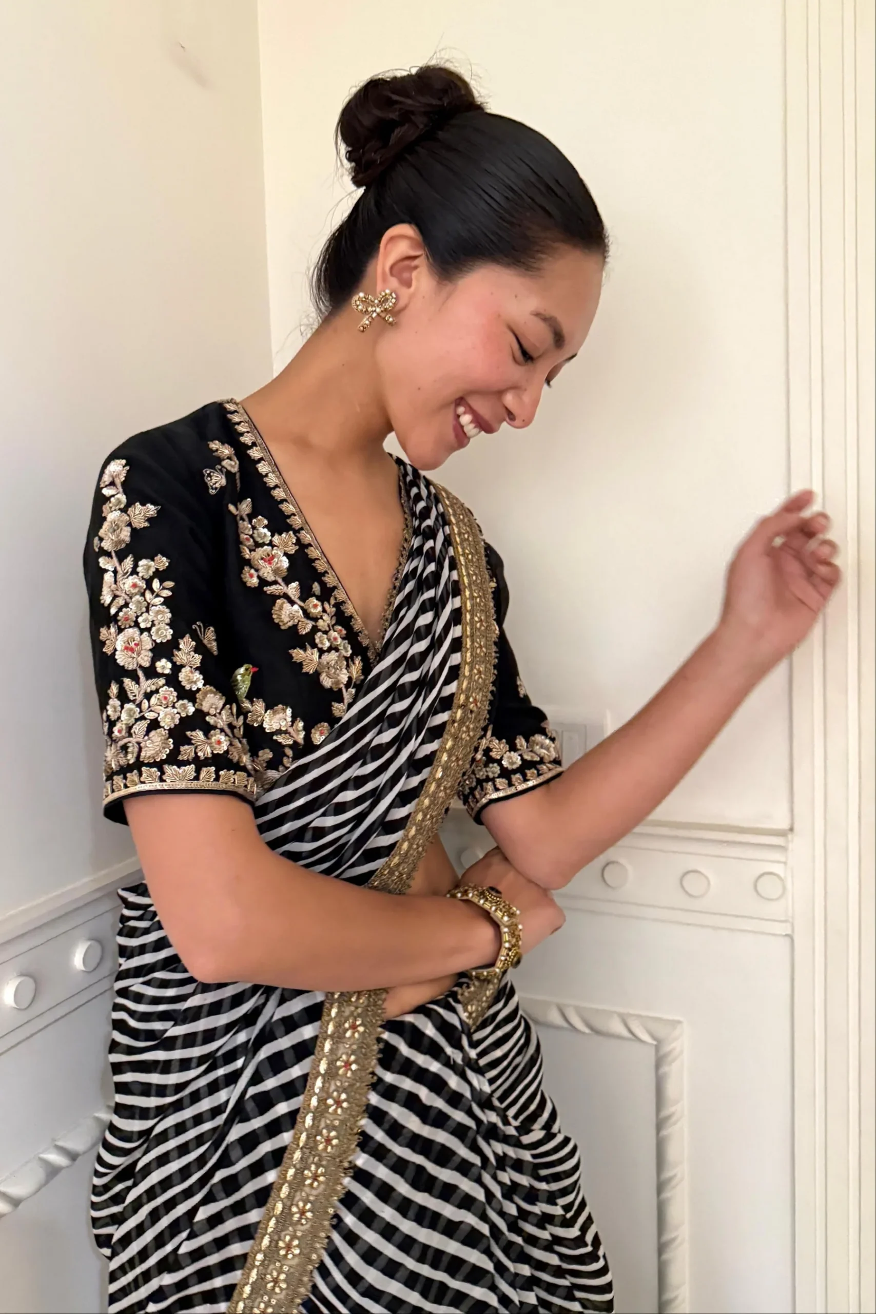 This georgette shimmer Indian saree for cocktail party was a hit; right amount of sparkle, not overdone, and super easy pleats.