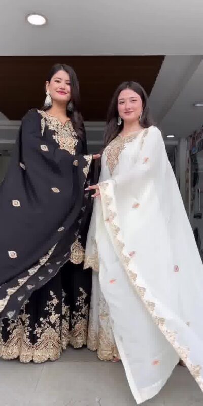 TOP Fabric :- Havy fox Georgette Work :- Heavy Embroidery with Thread & Sequence Work with flair top Inner:- butter Creap Size :- Free Size Semi Stitched Length : 42-43 inch Bottom Fabric :- Havy fox Georgette Work:- Heavy embroidery tred and dori work with kali join Bottom Inner :- butter creep Length : 39-40 inch Dupatta Fabric :- Havy fox Georgette Work :- Heavy embroidery thread with dori work for side border Size :- 2.20.Meter |