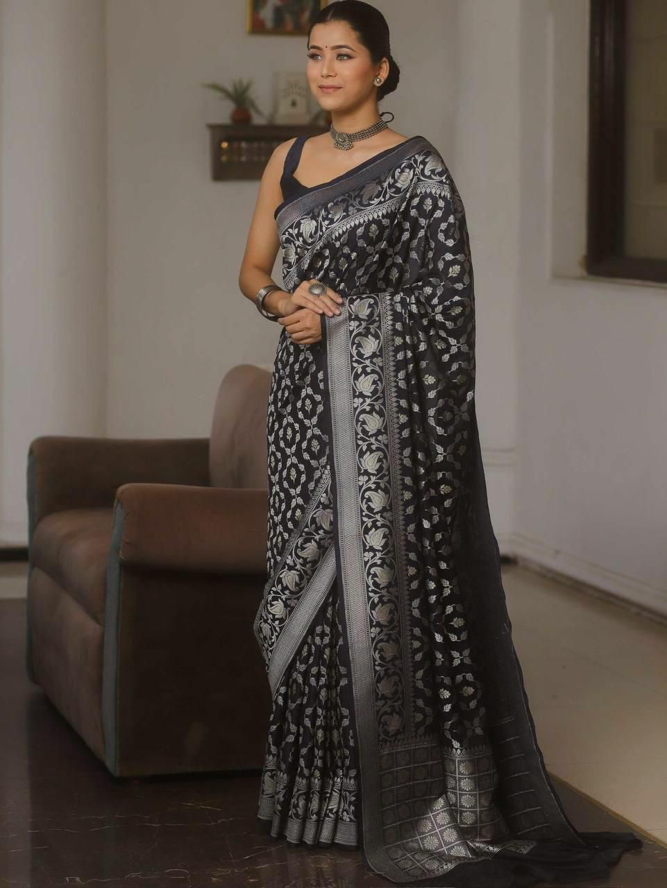 Black Lichi Silk Jacquard Border Work Saree