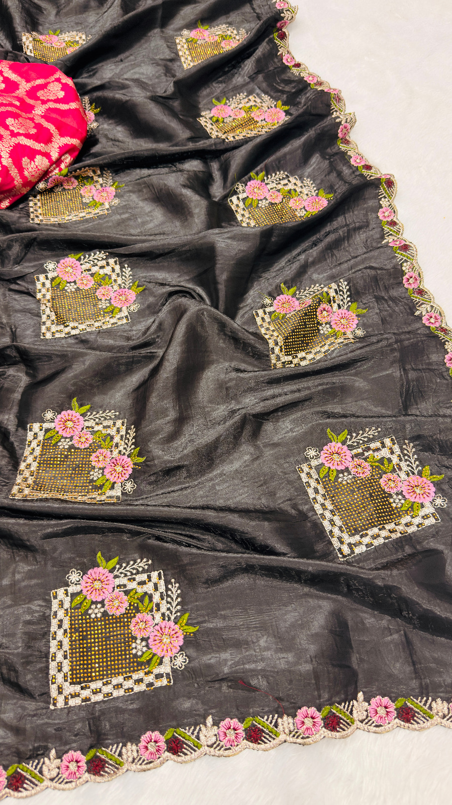 Saree Detail Saree Fabric : Pure paper silk crush Saree Work : Beautiful Floral Embroidery all over The Saree It also has Swarovski work on the buttas. With very beautiful cut work borderBlouse Fabric : Teamed with a Beautiful Pure Benarasi Silk Contrast Blouse |