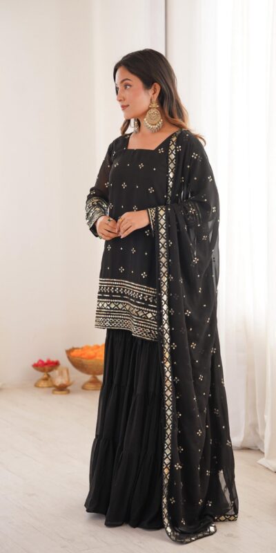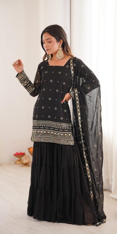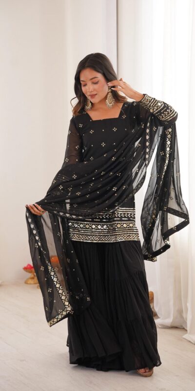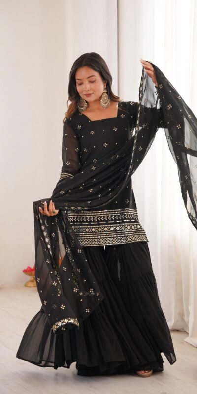 Stitching: Fully Stitched & Ready to Wear TOP: Fabric: Pure Heavy Georgette With Embroidery Sequence Work Sleeves: Full Inner: Heavy Micro Cotton Length: 31-32 inches Sizes Available: Free Size Semi Stitched Bottom (Ruffle Sharara): Fabric: Pure Heavy Georgette Length: 39-40 inches Flair : 6 Mtr Dupatta : Fabric: Pure Heavy Georgette With Embroidery Sequence Work |