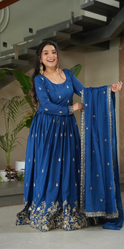 Gown :- Fabric & Work:- Chinon With Embroidery Zari Sequins-work Size: – Free Size Semi Stitched Length:- 56 Inch Flair:- 3.5 Mtr Lining:- Cotton (Full Inner Top To Bottom) Sleeve:- Full Sleeves Neck Type: – Round Neck Dupatta :- Fabric :- Chinon With Sequins Embroidered Work With Designer Lace Border Length :- 2.25 Mtr |