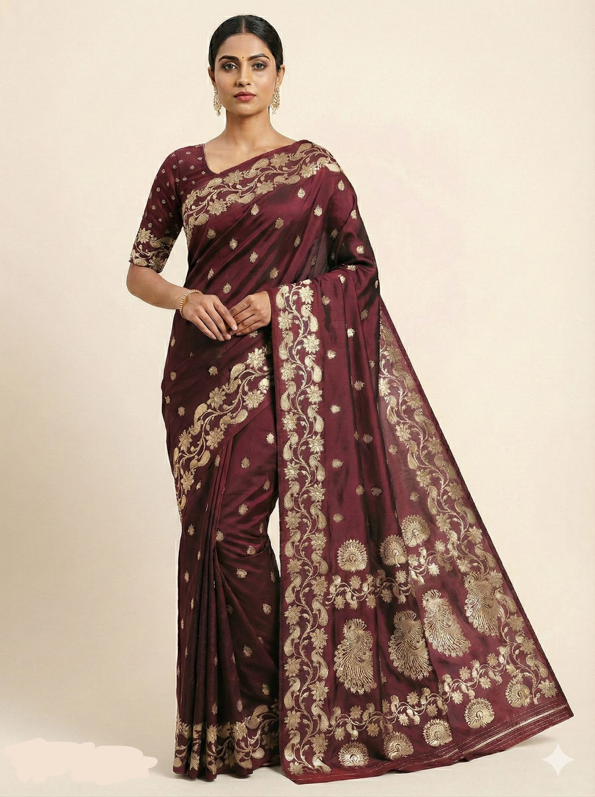 all-over self weaving with zari motifs.  with a contrasted rich pallu and an  unique border adorned with heavy zari weaving,