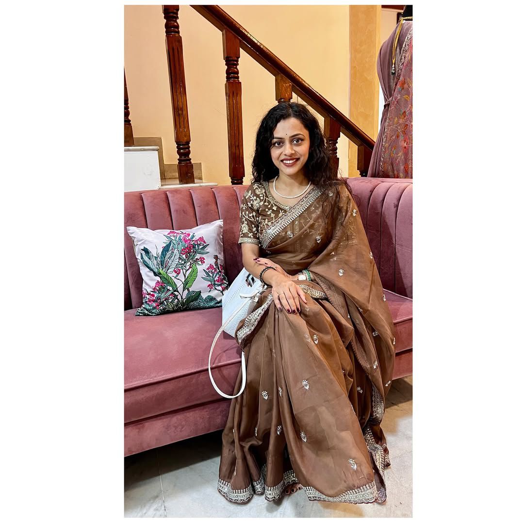 Brown Soft Organza Zari Embroidery Work Saree