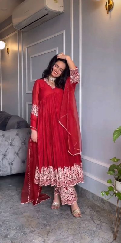 | Fabrics | Top :- Pure Chinon Silk & Crush With Embroidery Work With Fancy Full Sleeves