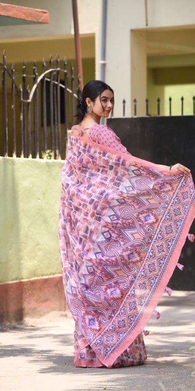 Fabrics Saree : Heavy linen Work : Beautiful Digital Print Blouse :Running