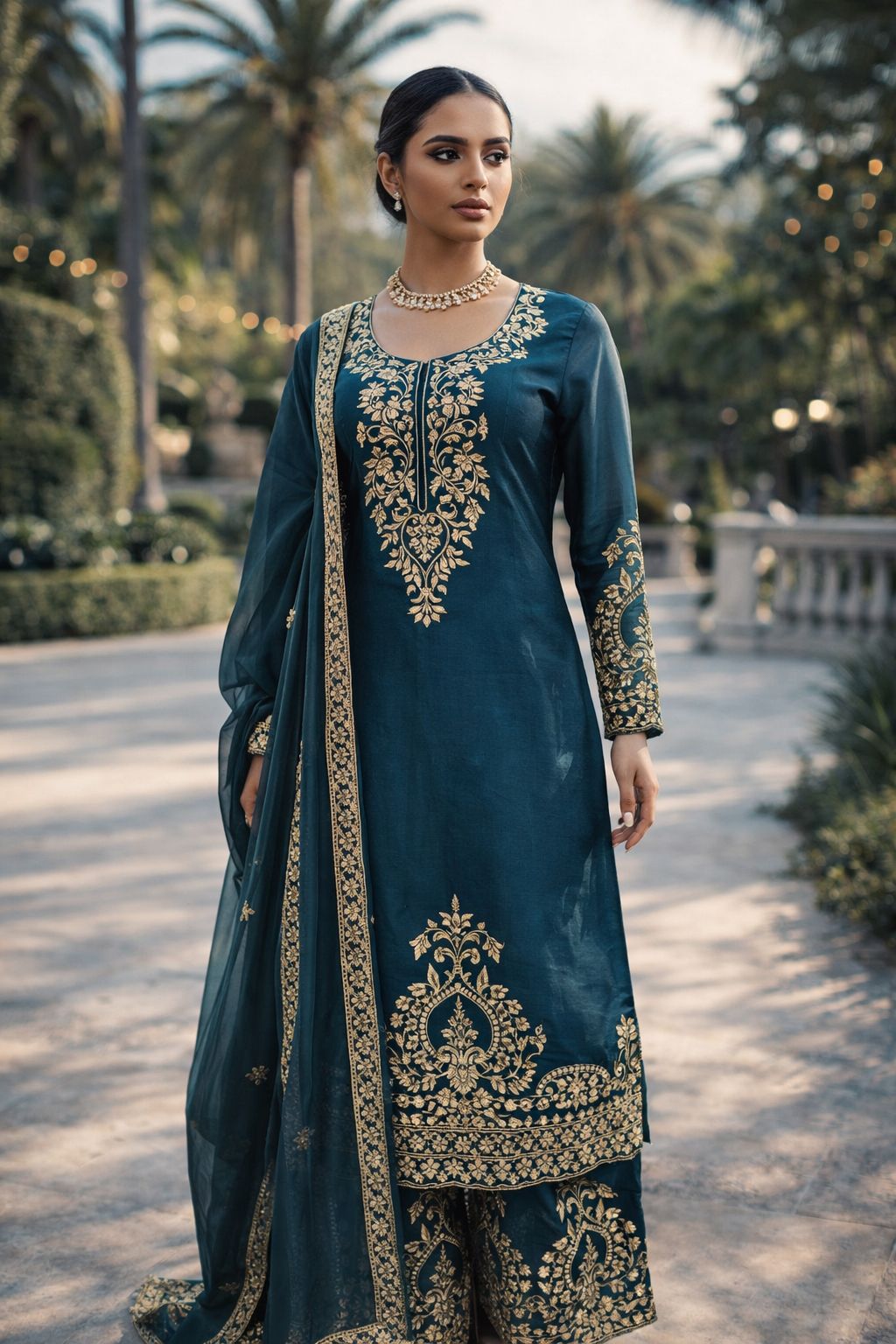 Classic Teal Blue Zimmy Silk Thread Work Salwar Suit