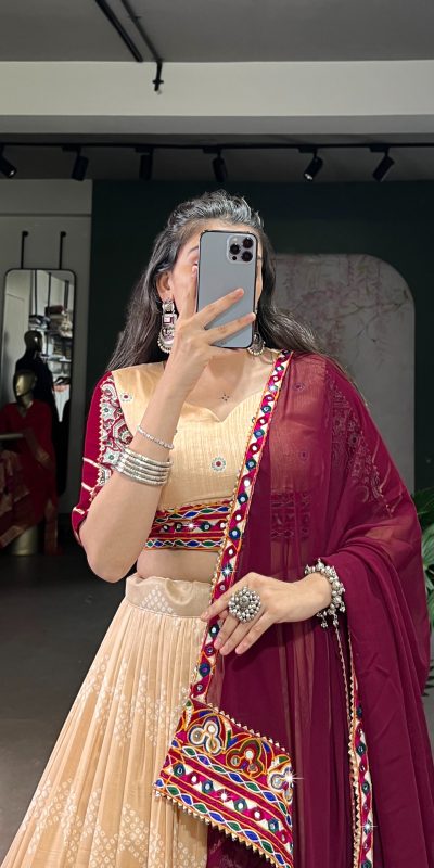 | Fabrics | Lehenga (Stitched) Lehenga Fabric : Tasar Silk Lehenga Work : Print With Foil Work And Real Mirror Gamthi Work With Lace Touch Up Lehenga Waist : SUPPORTED UP TO 42 Lehenga Closer : Drawstring With Heavy Tassels and Zip Stitching : Stitched With Canvas and attached with Can Can Length : 41 Flair : 3.80 Meter Inner : Micro Crepe Blouse (Stitched) Blouse fabric : Tasar Silk Blouse Work : Print With Foil Work And Real Mirror Gamthi And Cowrie (Kodi) Lace Touch Up Sleeve Length : 11 Blouse Length : 15 Dupatta Fabric : Tasar Silk Dupatta Work : Print With Foil Work And Real Mirror Gamthi Work With Lace Border Also Comes With Tassels Dupatta Length : 2.40 Meter |