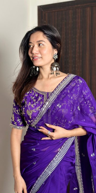 Dazzling Violet Color Pure Soft Organza Embroidery Zari Saree