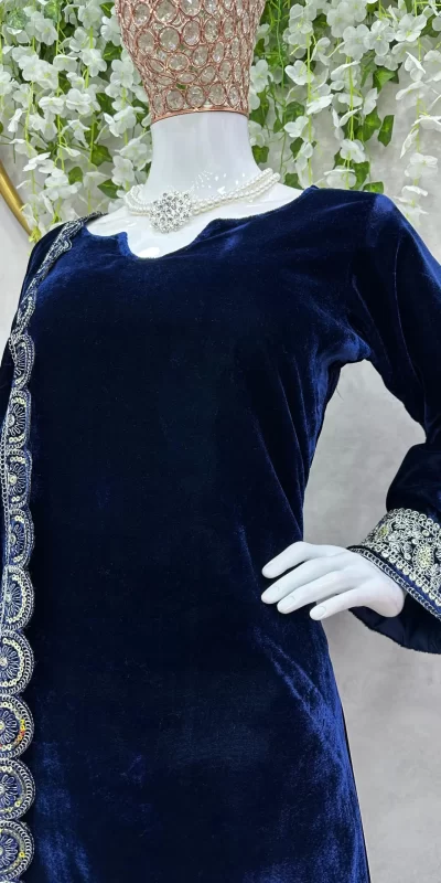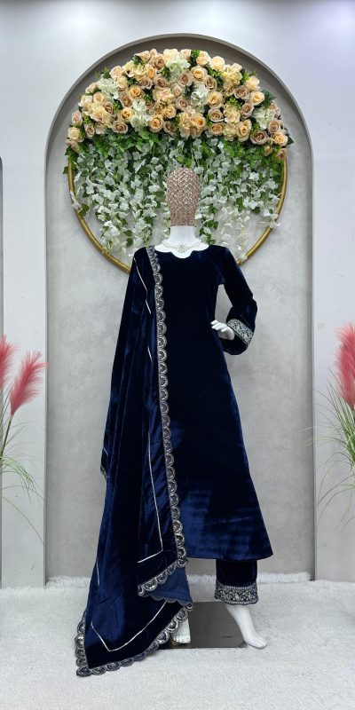 Divine Navy Blue Color Velvet With Cording Dori Work Long Length Gown