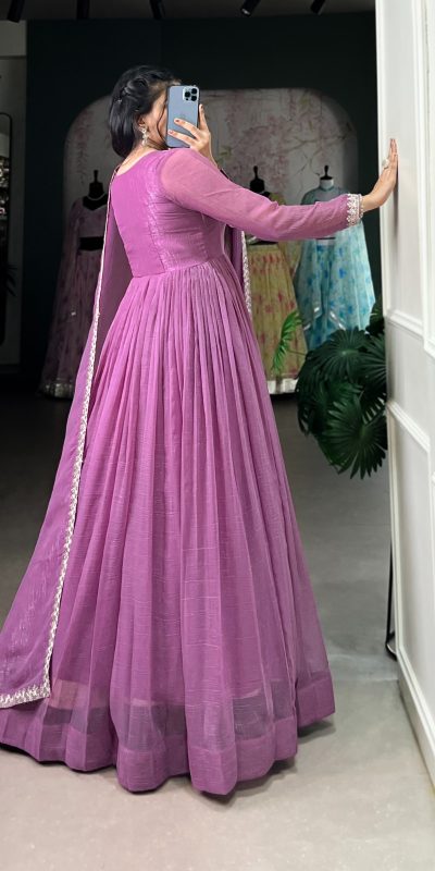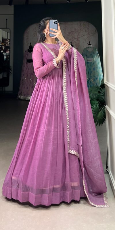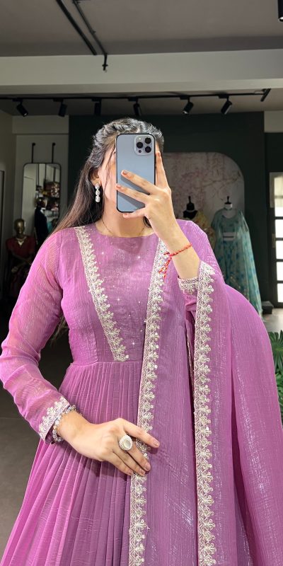 Elegant Purple Color Silver Glory Hotfix Sequins Thread Work Gown