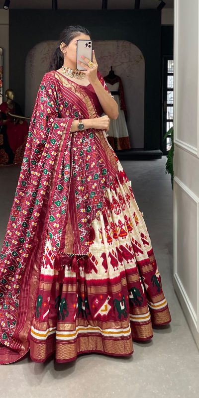Exclusive Off White Color Tussar Silk Patola Printed Lehenga Choli