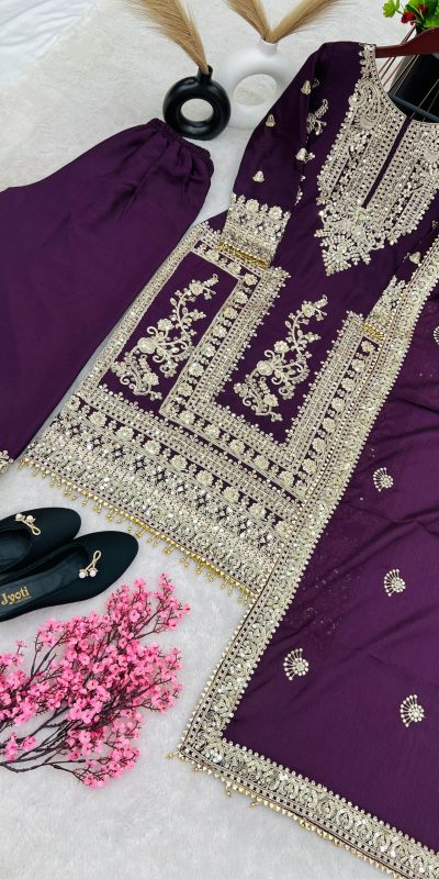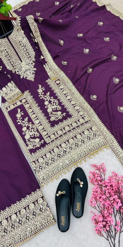 Fancy Purple Chinnon Silk Embroidery Coding Dori Salwar Suit