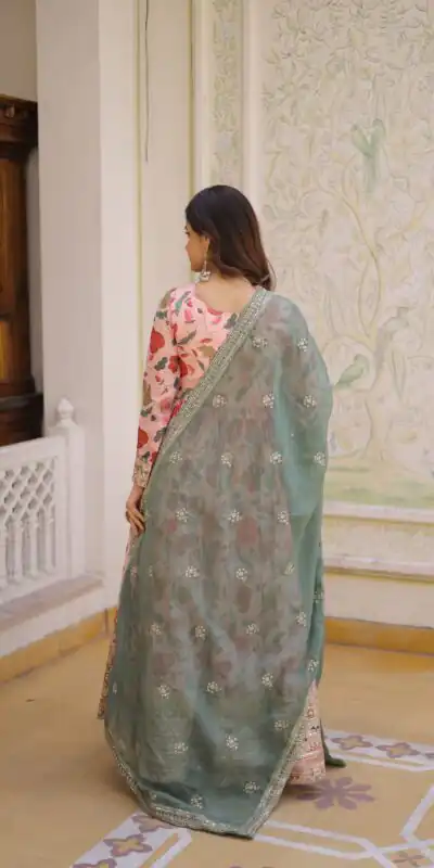 fabric & Work *:- Digital Printed Russian Silk With Embroidery Zari Sequins-work
