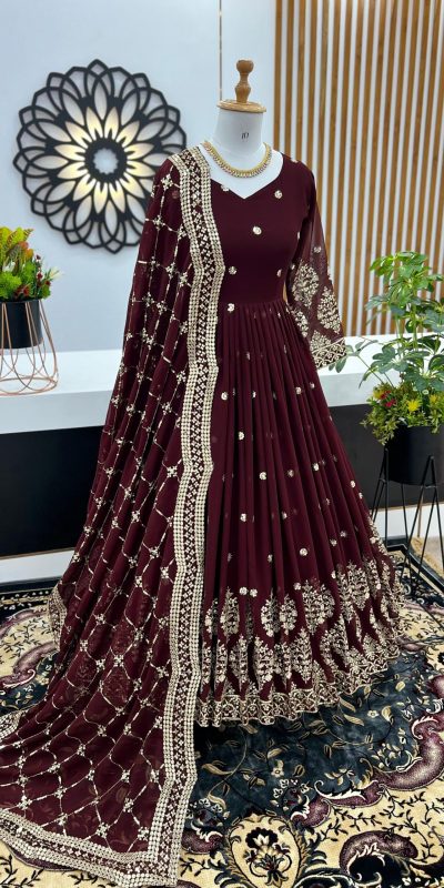 | Fabrics | Gown Fabric : Faux Georgette Gown Length :53-54 Inches Inner : Micro Cotton Work :Sequence Embroidery Work Size : Free Size Type : Semi Stitched Gown Flair : 3 M Bottom : No Type : Semi Stitched Dupatta Fabric : Faux Georgette Work : Embroidery Sequence work and Lace Border Dupatta Length : 2.10 mtr |