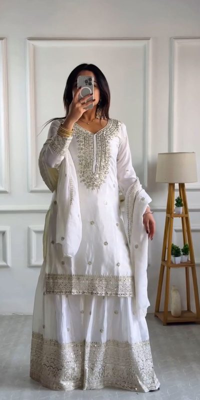 | Fabrics | Top :- :Pure Heavy Chinnon Silk With Embroidery And 5mm Sequence Work Sleeves :- Chinnon Silk With Embroidery And 5mm Sequence Work With Full Sleeves Dupatta :-:Pure Heavy Chinnon With Four Side Lace BorderSharara inner :Heavy Micro CottonSharara Palazzo Fabrics: Pure Heavy Chinnon Silk With 5mm Embroidery Sequence Work With Fully Flair Top Inner :-Heavy Micro Cotton Top Length :- 36-37Inch Size:- Free Size Semi Stitched |