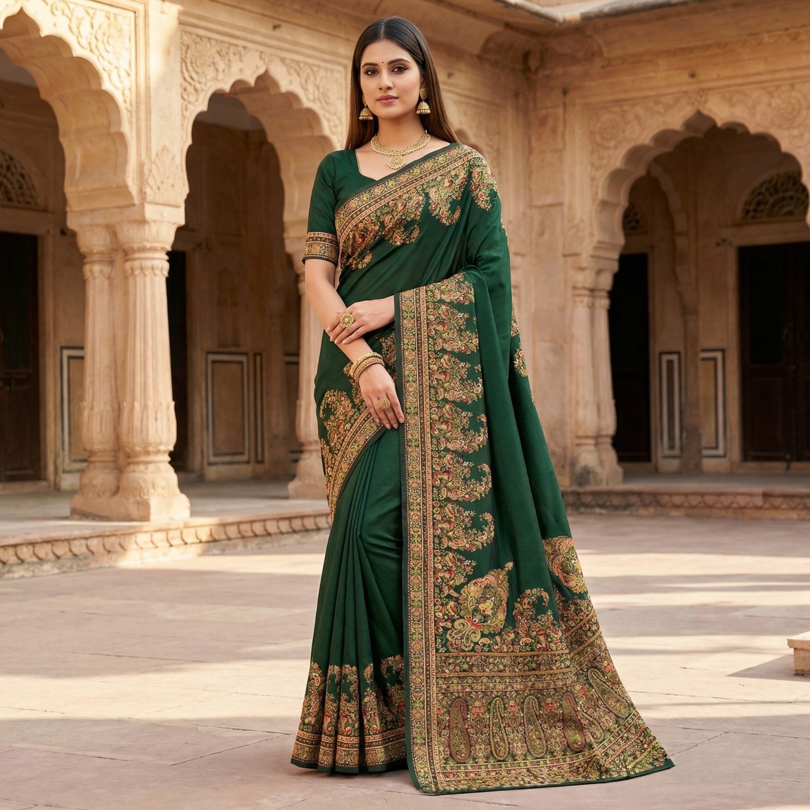 Saree :- rich, smooth body paired with a multi color paisley border and pallu Comes with a contrasting enhanced with elegant woven motifs.