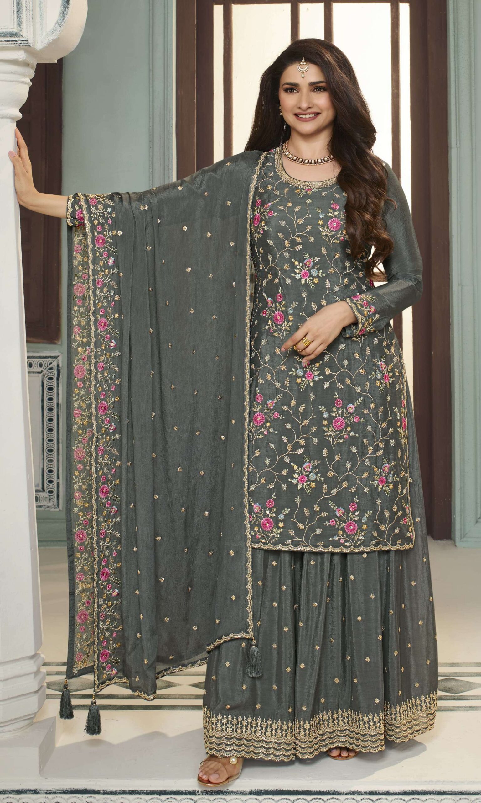Material & Fabric Details Top :- Heavy Chinon Work : Embroidery multi workSleeves :- Heavy Chinon Sleeves Work : Embroidery multi work Inner :- Santoon Size:-Free Size Semi Stitched Palazzo :- heavy Chinon & multi work Palazzo Length: - 44 inner:-Santoon Type :- Semi Stitched ( Material ) Dupatta :-heavy Chinon+ multi work |