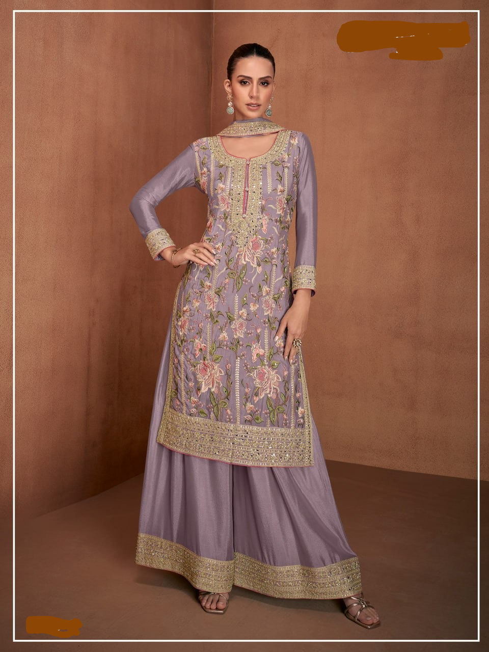 Fabrics Details :- TOP :- Heavy Chinon with Embroidery Multi & 3 mm Mat Sequence work Sleeves :- Heavy Semi Chinon Silk TOP :- semi stitched INNER :- Attach Heavy Crep Silk Length :- Max Up to 44”Size :- Max Up to 60”Palazzo :- Heavy Semi Chinon Silk READY MADE INNER Attach Heavy Crep SilkWORK :- Multi & Jari 3 mm Sequence & Codding Embroidery Stitch Work Dupatta :- Heavy Semi Chinon Silk |