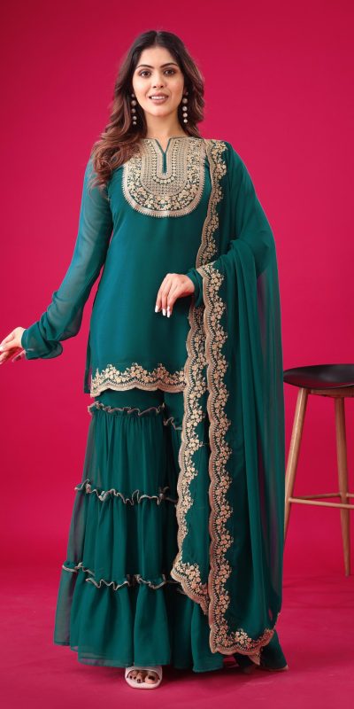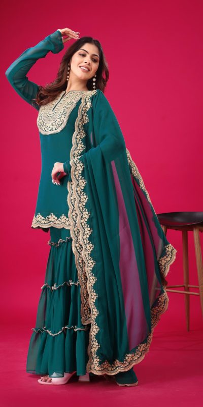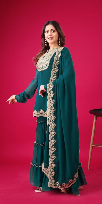 Fabrics Top Fabric :Blooming Faux Georgette With Heavy Embroidery 3mm Sequence Thread Work With Full Sleeve Top Inner : Heavy Micro Cotton Top Size : Free Size Fully Stitched Ready To Wear Top Length : 31-32 inchPalazzo Fabrics : Blooming Faux Georgette With Elastic Full stitched Palazzo inner : Heavy Micro Cotton  Length: 40-41 Inch fully stitched Dupatta Fabric : Blooming Faux Georgette With Embroidery 3mm Sequence Work With Lace Border