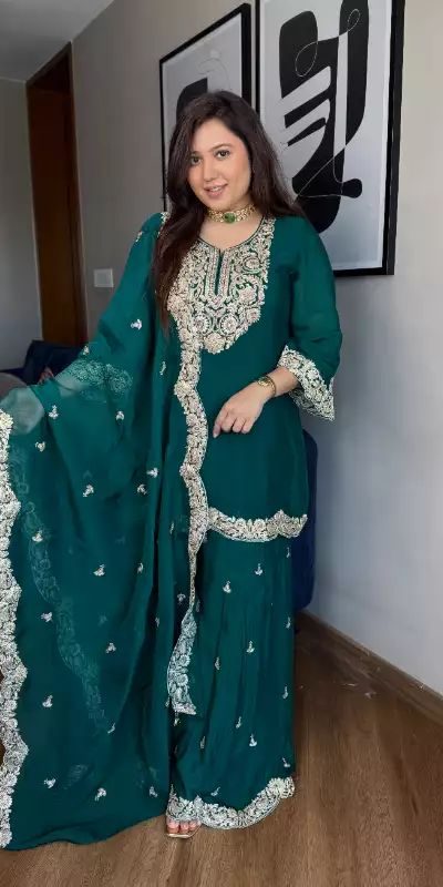 | Fabrics | Top Fabric :Pure Chinnon Silk With Heavy Embroidery Coding Dori-Sequence Work With Full Sleeve Top Inner : Heavy Micro Cotton Top Size :Free Size Fully Stitched Ready To Wear Top Length : 39-40 Inch Palazzo Fabrics :Pure Chinnon Silk With Heavy Embroidery Coding Dori-Sequence Work With Elastic fully stitched Plazzo Length:40-41 Inch Dupatta Fabric : Pure Chinnon Silk With Embroidery Coding Dori-Sequence Work With Lace Border |