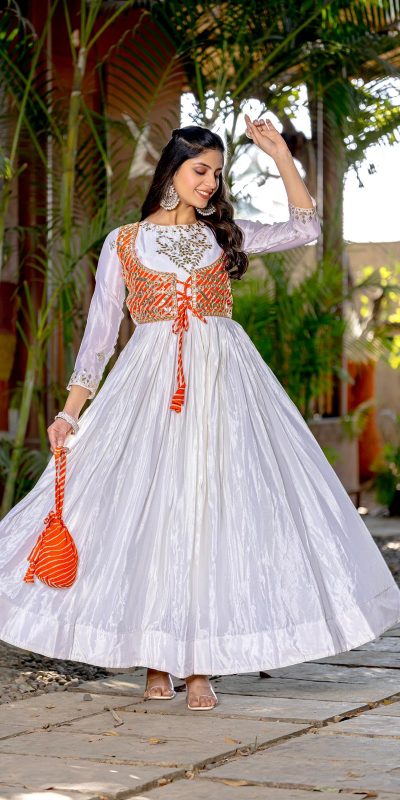 Ram 084 White Color Chinon Laheriya Print Gotta Patti Cording Work Anarkali Gown Wedding Party, Festive, Events Etc.4-6 Working Days@1949/- only