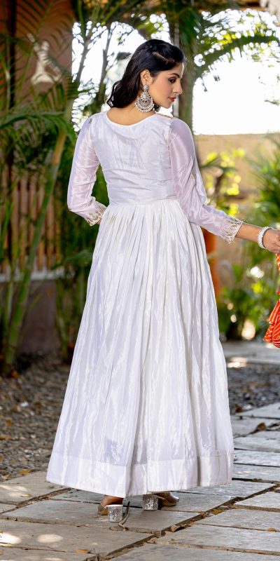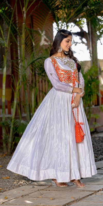 Magical White Color Chinon Laheriya Print Gotta Patti Cording Work Anarkali Gown