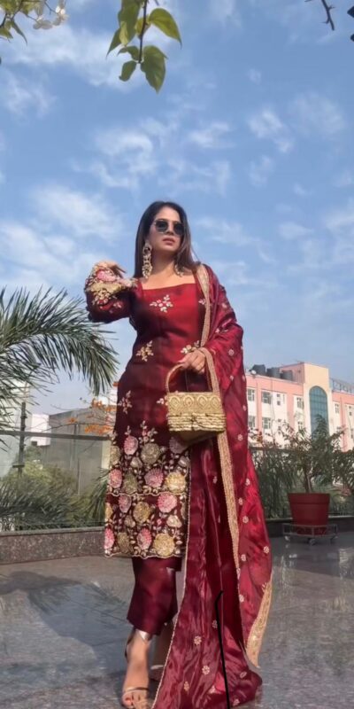 Maroon Organza Poly Silk Embroidery Work Salwar Suit