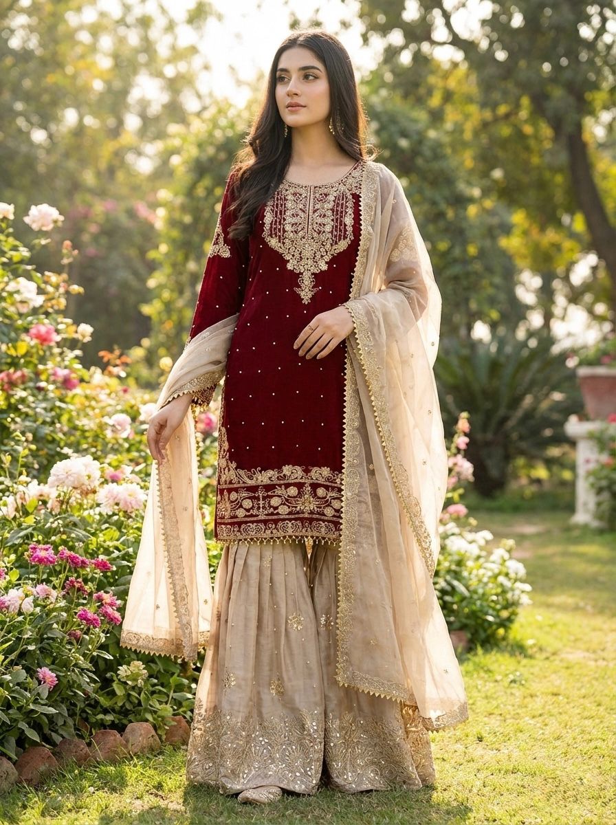 Maroon Organza Silk Embroidery Lace Work Salwar Suit