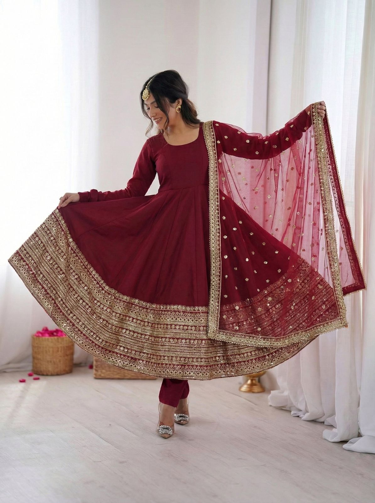 Anarkali Gown Anarkali Fabric :- Roman silk Anarkali Work :- codding sequence work Anarkali Inner :- Heavy Micro Cotton Sleeves :- Full Sleeves Length :- 48-49 Inches Anarkali Flair :-3.70 meter Size :- Free Size Semi Stitched Bottom Fabric :- Natural Crape Length :- 40-41 Inches Dupatta Fabric :- Heavy Net Work :- codding sequence and Embroidery work Ready made Lace Border Length :- 2.10 meter |