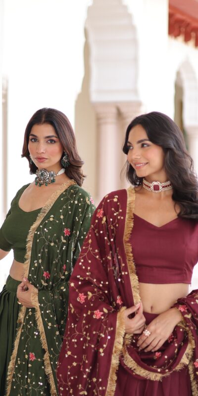 Lehenga:- (Full-Stitched) Fabric & Work :- Vichitra Silk With Heavy Sequins & Thread Embroidered work Length :- 42” Waist :- 42” Inner :- Cotton Flair :- 3 Mtr Closure :- Zip Attached & With Dori Latkan Stitching Type :- Stitched with Canvas Blouse:- (Un-stitched) Fabrics :- Vichitra Silk Length :- 1 Mtr (Un stitched) Dupatta :- Fabrics & Work :- Vichitra Silk with Sequins & Thread Embroidered work with Designer Lace Border Length :- 2.2 Mtr |