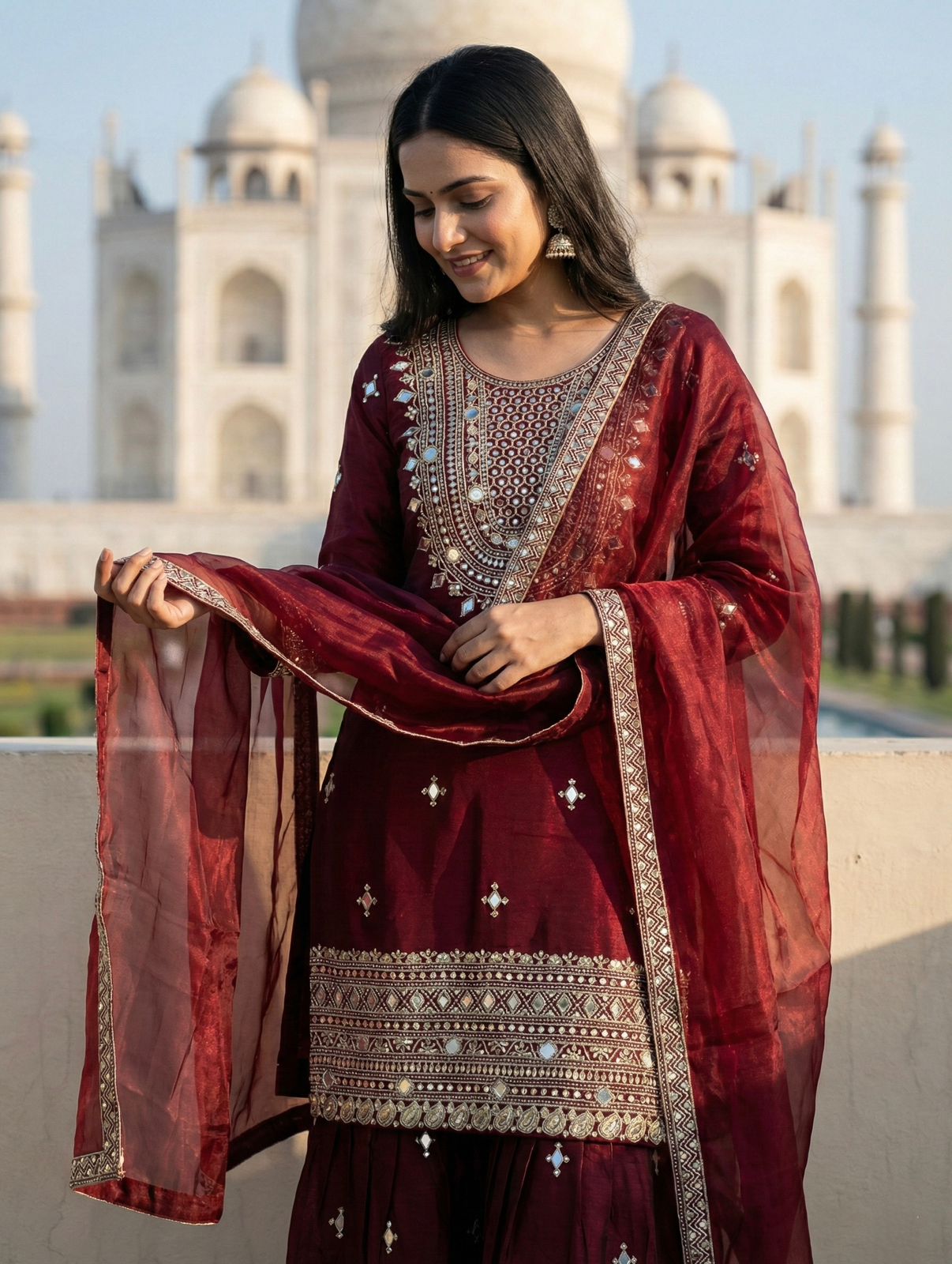 Maroon Zimmy Silk Embroidery Work Work Sawar Suit