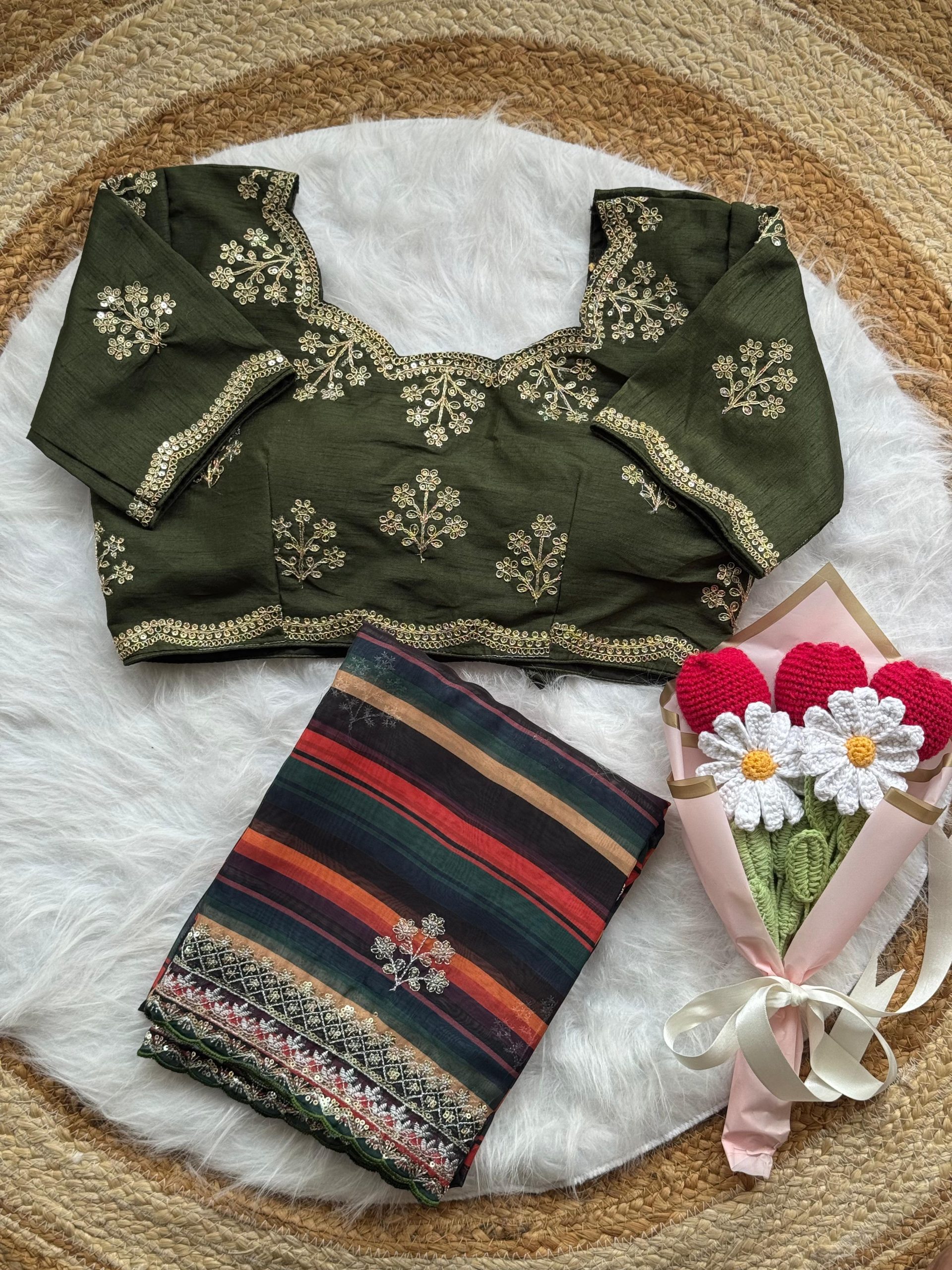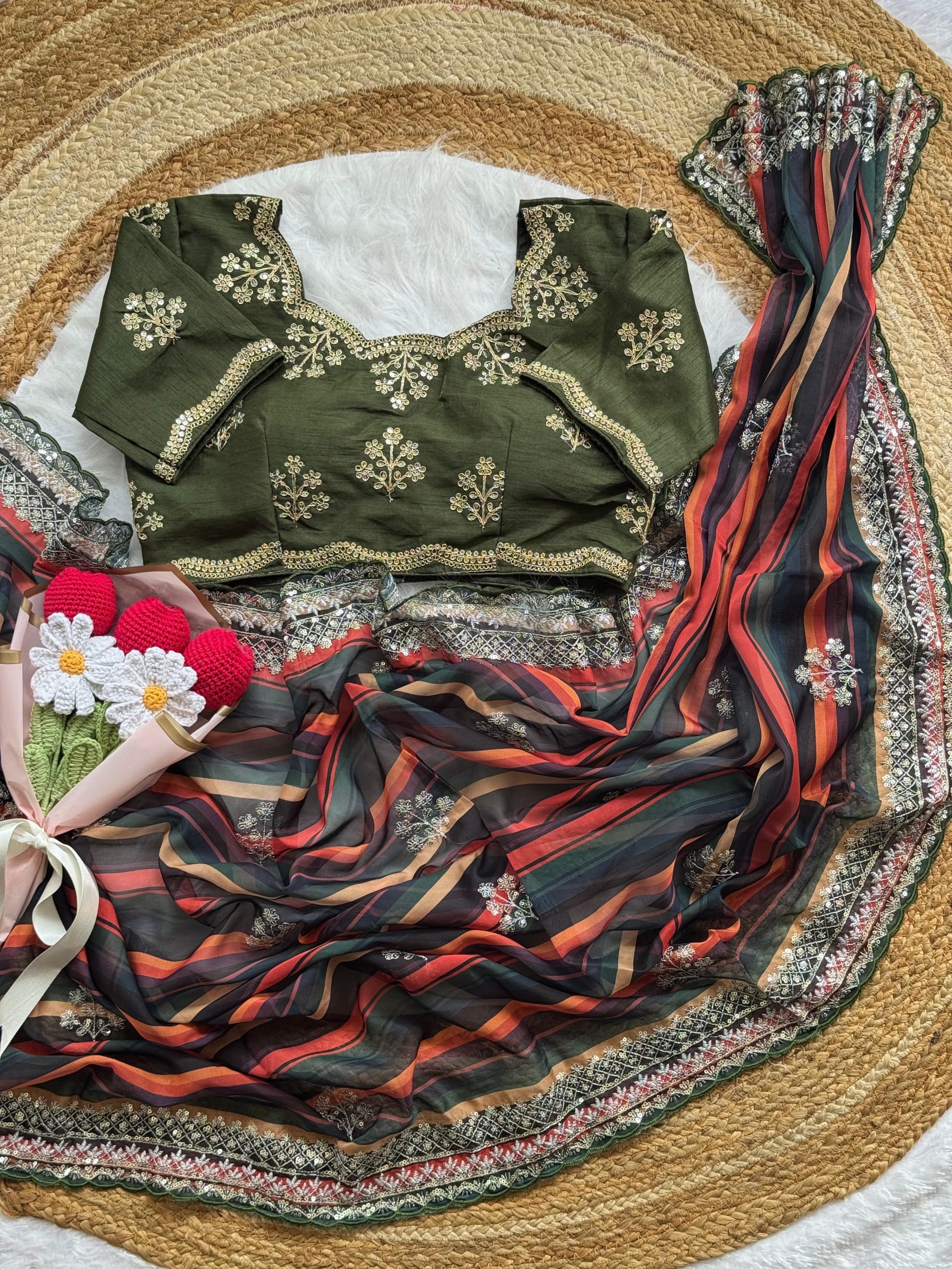 Mehandi Soft Organza Embroidery Work Lace Saree