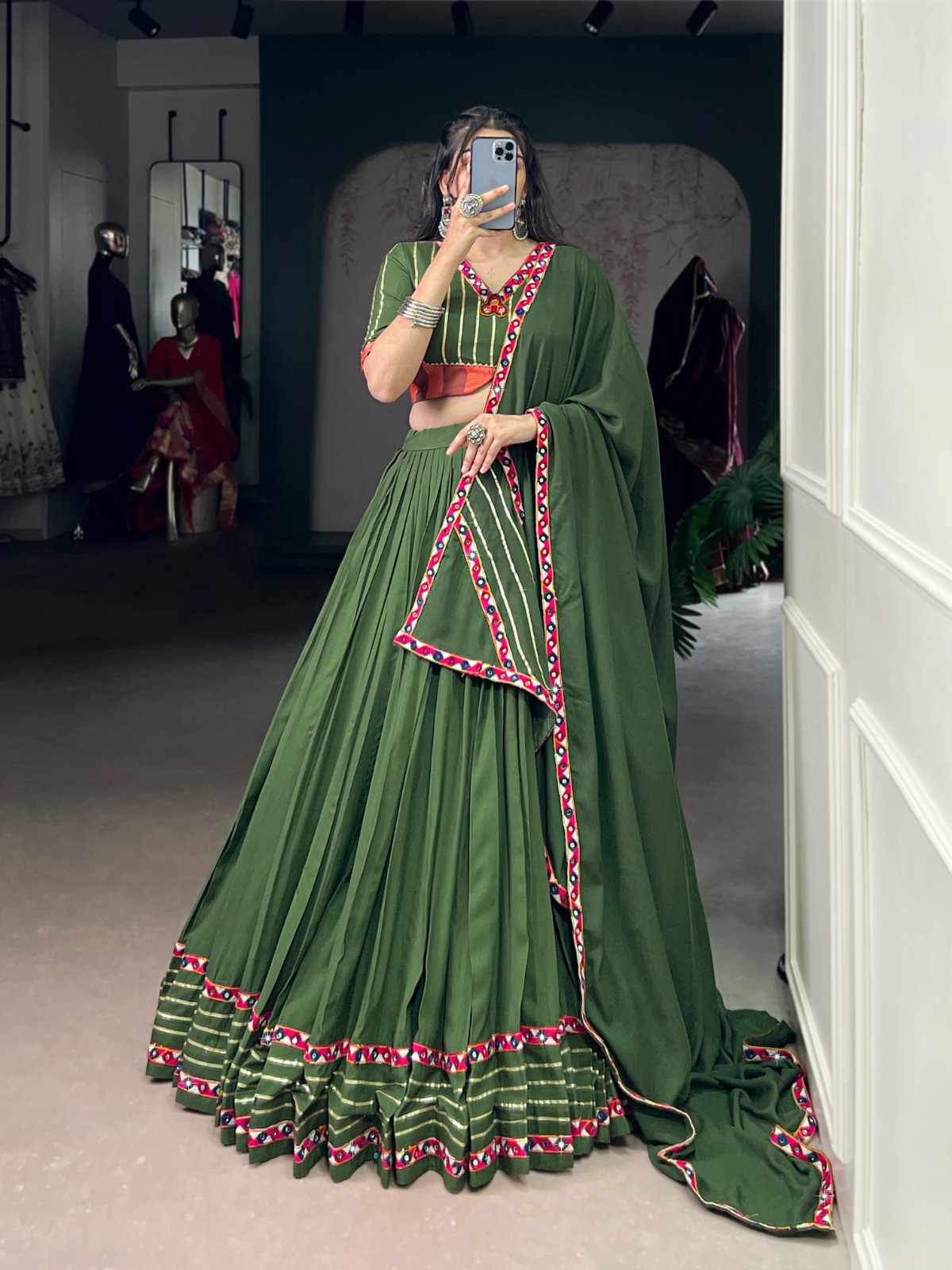 Mehendi Rayon Mirror Gamthi Work Lehenga Choli