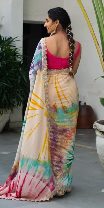 | Fabrics | Saree :Pure shibori printed Chinon fabric saree with Beautiful Multicolored Embroidery Coding Sequins Lace work :Embroidery Coding Sequins Lace Blouse : contrast Blouse with attached same lace on blouse |
