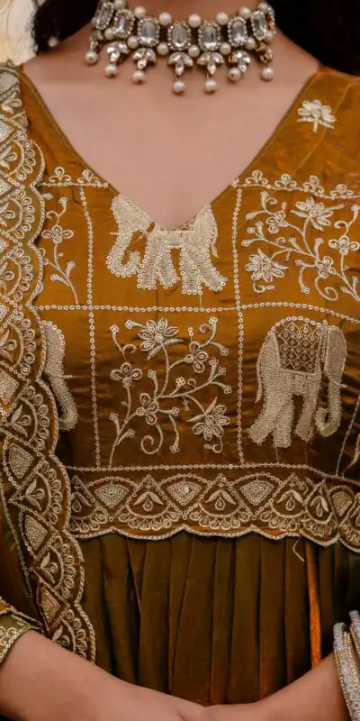 Mustered Fendy Satin Embroidery Work Gown