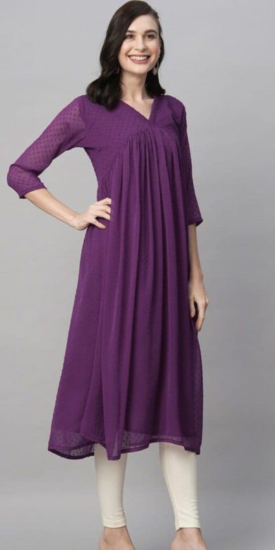 Nice Purple Color Chiffon V-Neck Gathered Midi Kurti