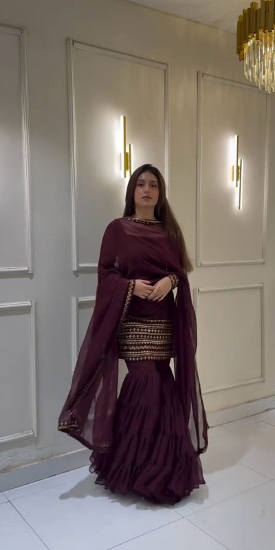 Fabrics Top Fabric : Heavy Georgette Embroidery Sequence Work With Full Sleeve Front Side Back Side Work Top Inner : Heavy Micro Cotton Top Length : 36 Inch Top Size. : Free Size Semi Stitched (FULLY STITCHED READY TO WEAR) Sharara Fabrics : Heavy Georgette With Fully Ruffle Flair Sharara inner : Heavy Micro Cotton Sharara Length : 40-41 Inch (fully stitched) Dupatta Fabric : Heavy Georgette With Embroidery Work Dupatta Length: 2.10MTR