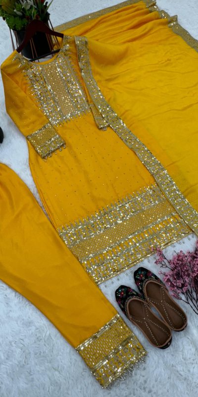 Nice Yellow Color Chinnon Silk Embroidery Sequence Salwar Suit