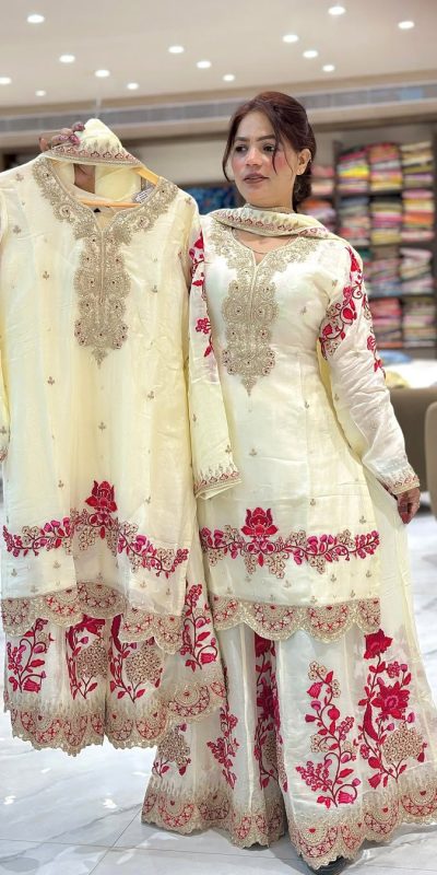 Palazzo Fabrics : Chinon silk Heavy Embroidery Work With Fancy Palazzo Less Work Fully Flair.