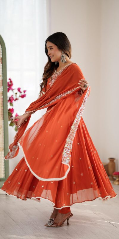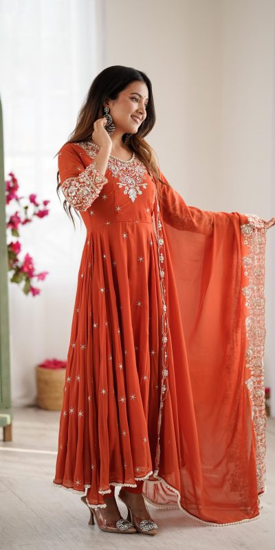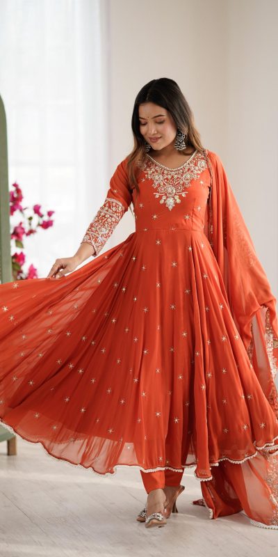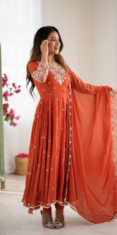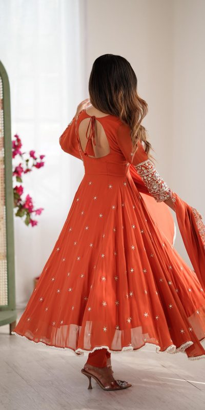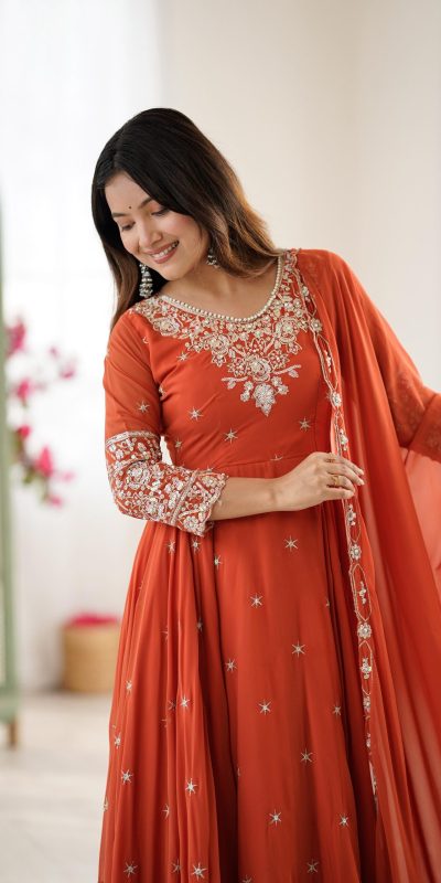 Orange Blooming Faux Embroidery Work Gown