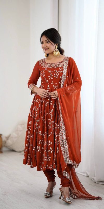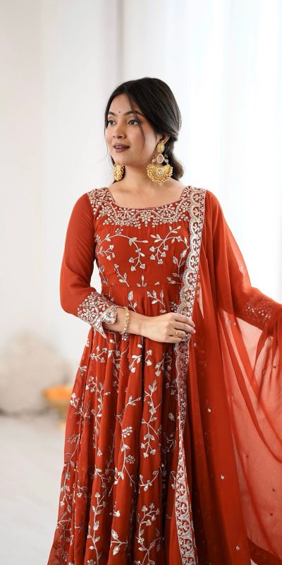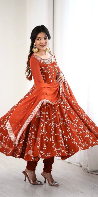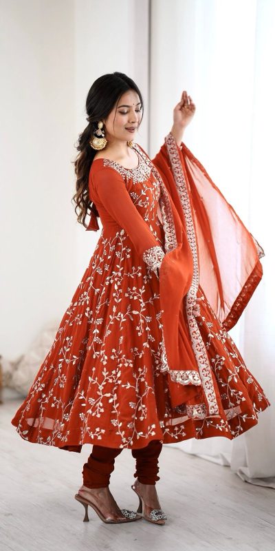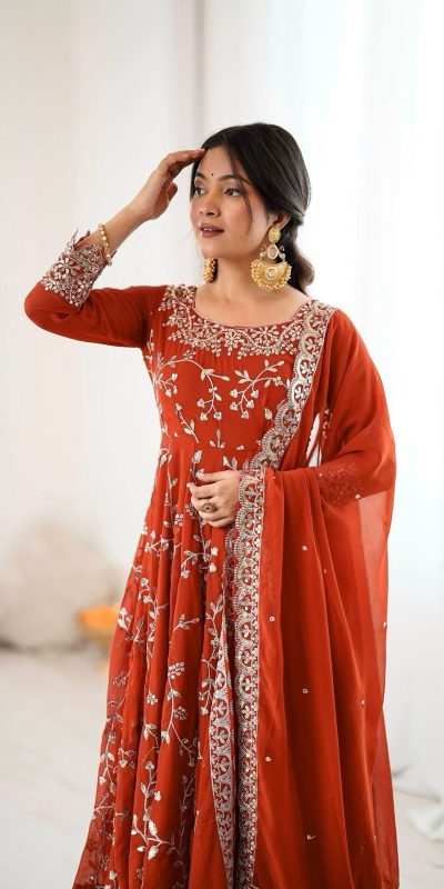 Orange Faux Georgette With Embroidery Gown