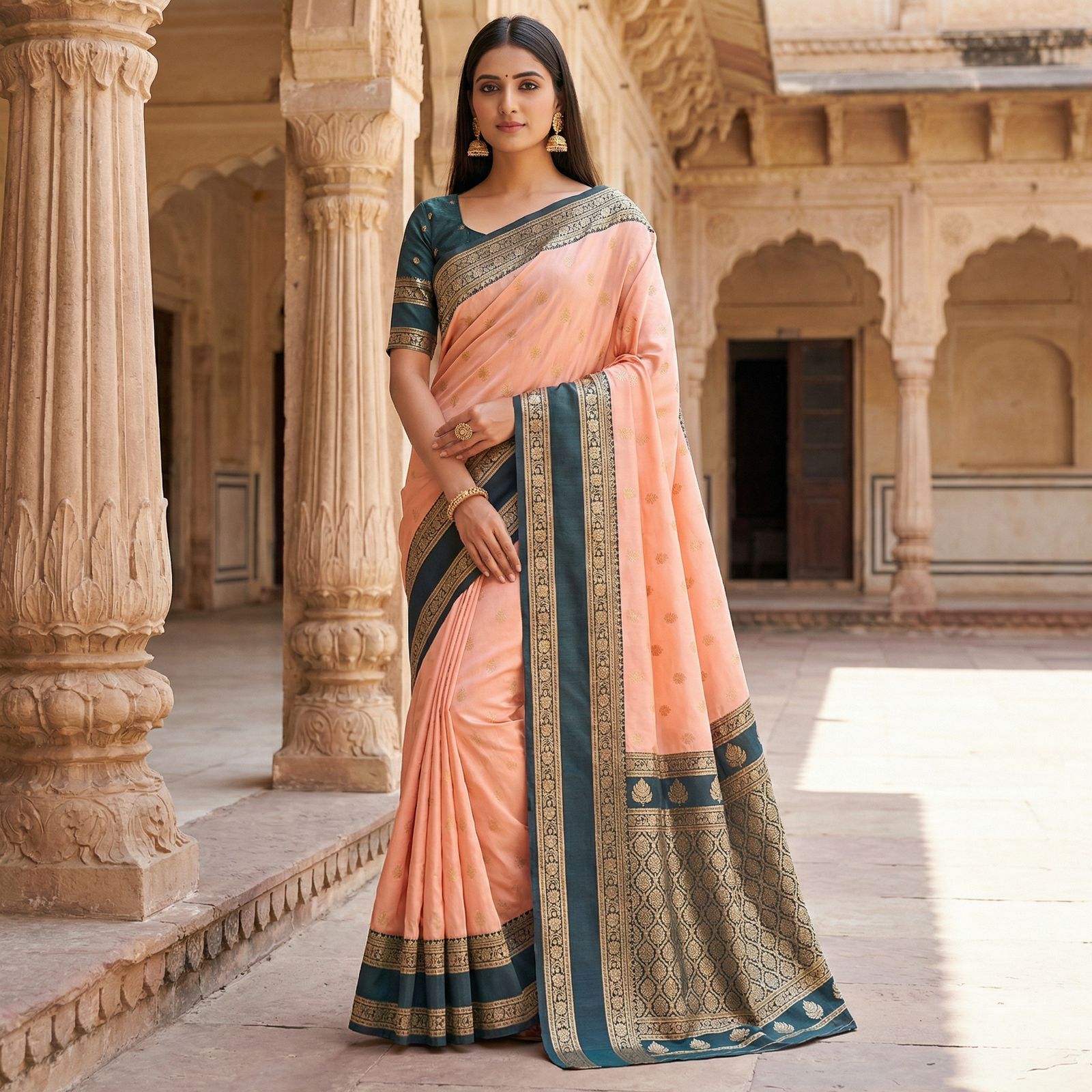 Peach Banarasi Gold Zari Work Saree